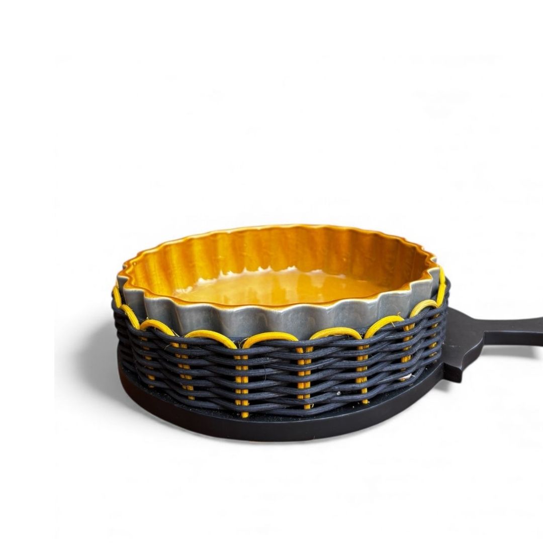 Rustic craft meets everyday elegance. The Cottage Country Quiche Basket – Medium pairs a scallop-edged ceramic dish in a striking grey and amber glaze with a handwoven cane basket and sturdy wooden base. Perfect for quiches, baked pastas, or festive tarts, it goes straight from oven to table, keeping things practical without losing style. The basket cushions the dish while the handle makes serving easy, and with its removable base, cleaning is effortless. It’s the kind of piece that makes casual dinners look styled and celebrations feel effortless.