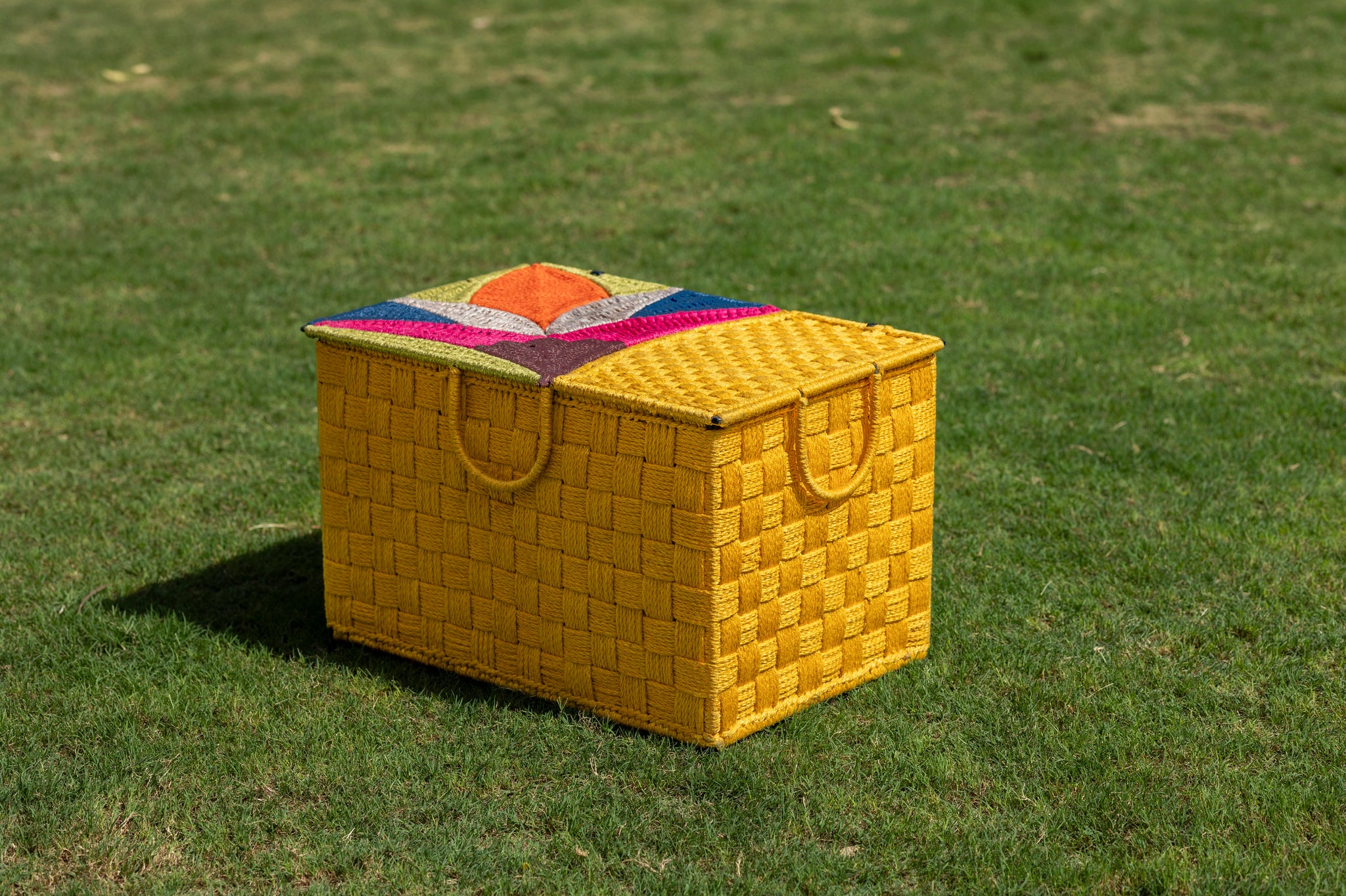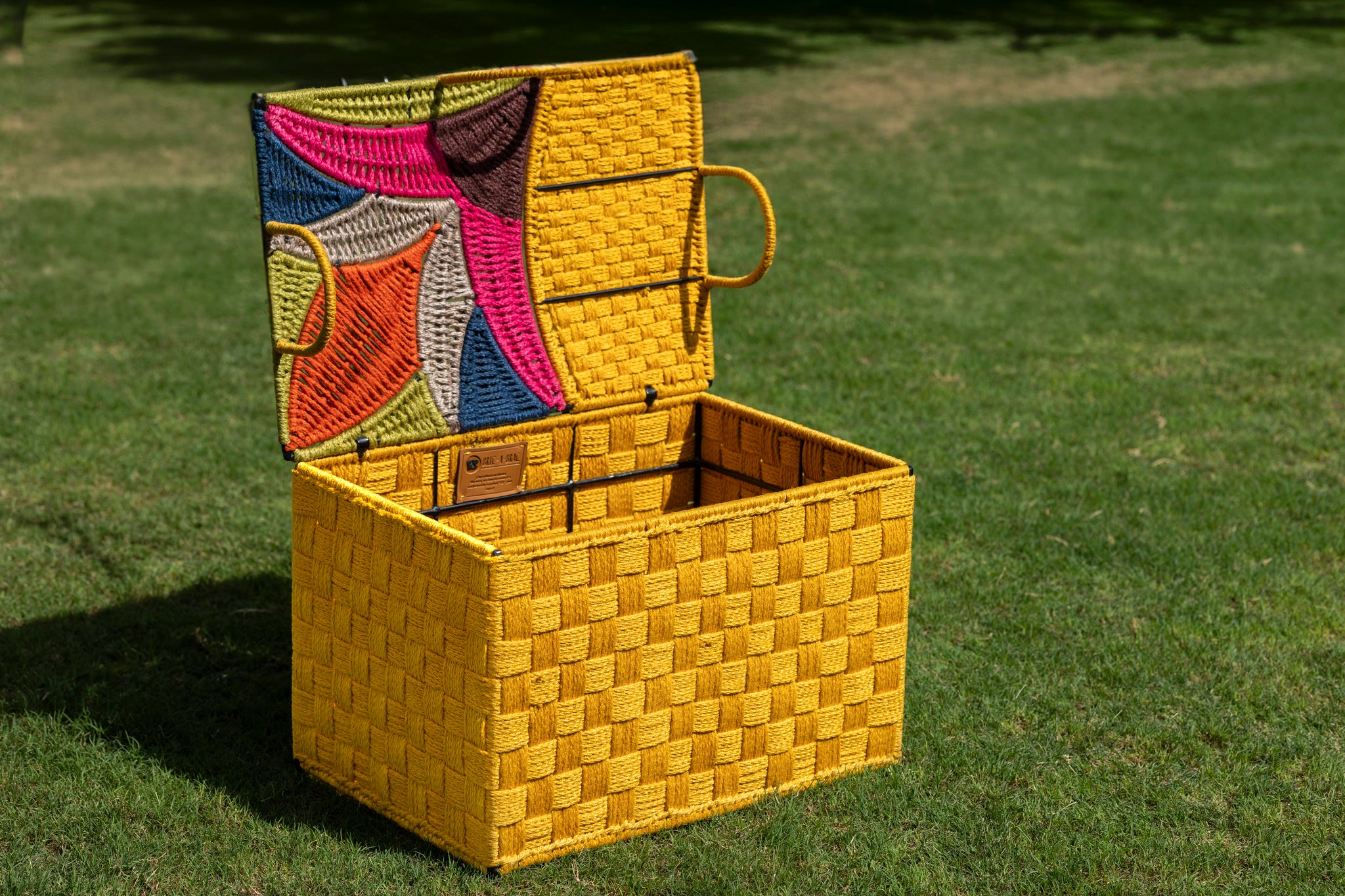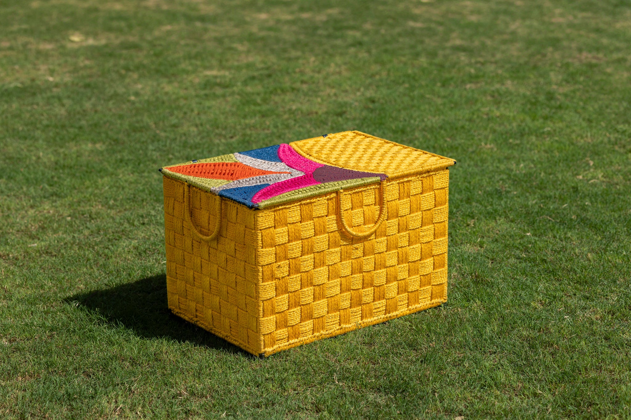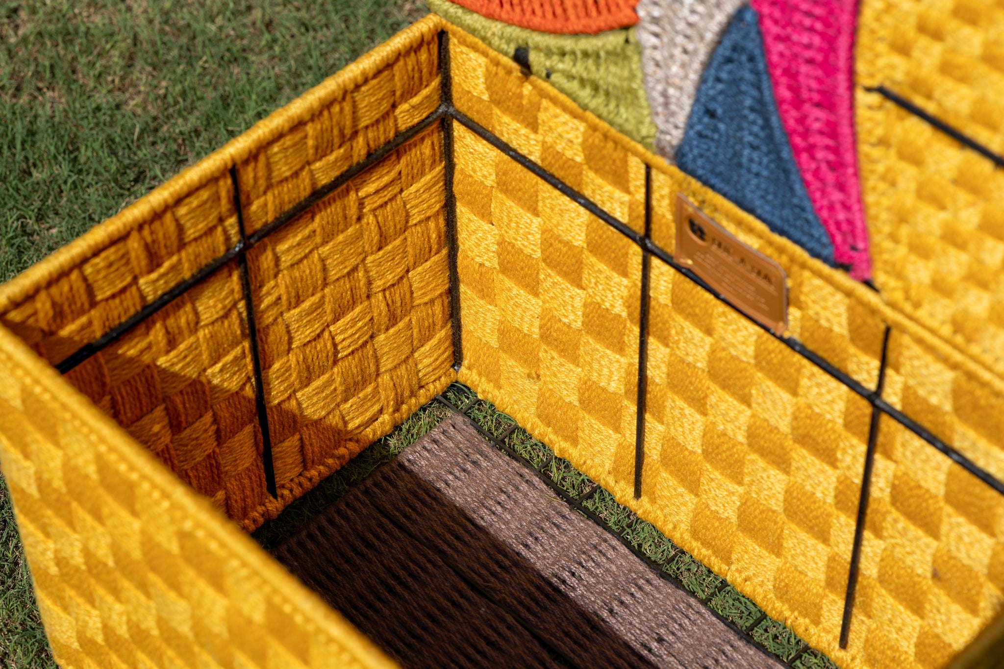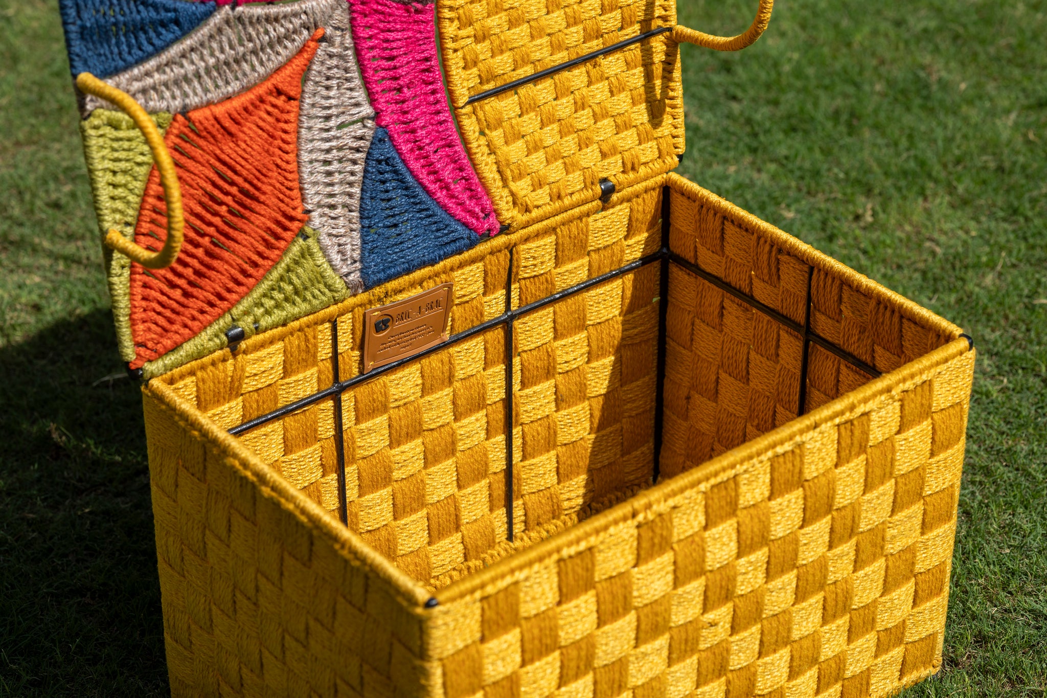 A box that’s as cheerful as it is useful. The Flower Bundle Box is handwoven with recycled PET yarn, giving plastic waste a second life in the form of bright, everlasting craft. Its bold yellow weave brings warmth, while the lid blooms with a playful floral motif in multicolour yarn, turning storage into a piece of art. Spacious enough for toys, linens, laundry, or seasonal essentials, it keeps clutter tucked away while keeping your space vibrant and styled. Lightweight yet sturdy, it’s built to move around with ease and stay beautiful in any corner, indoors or outdoors.