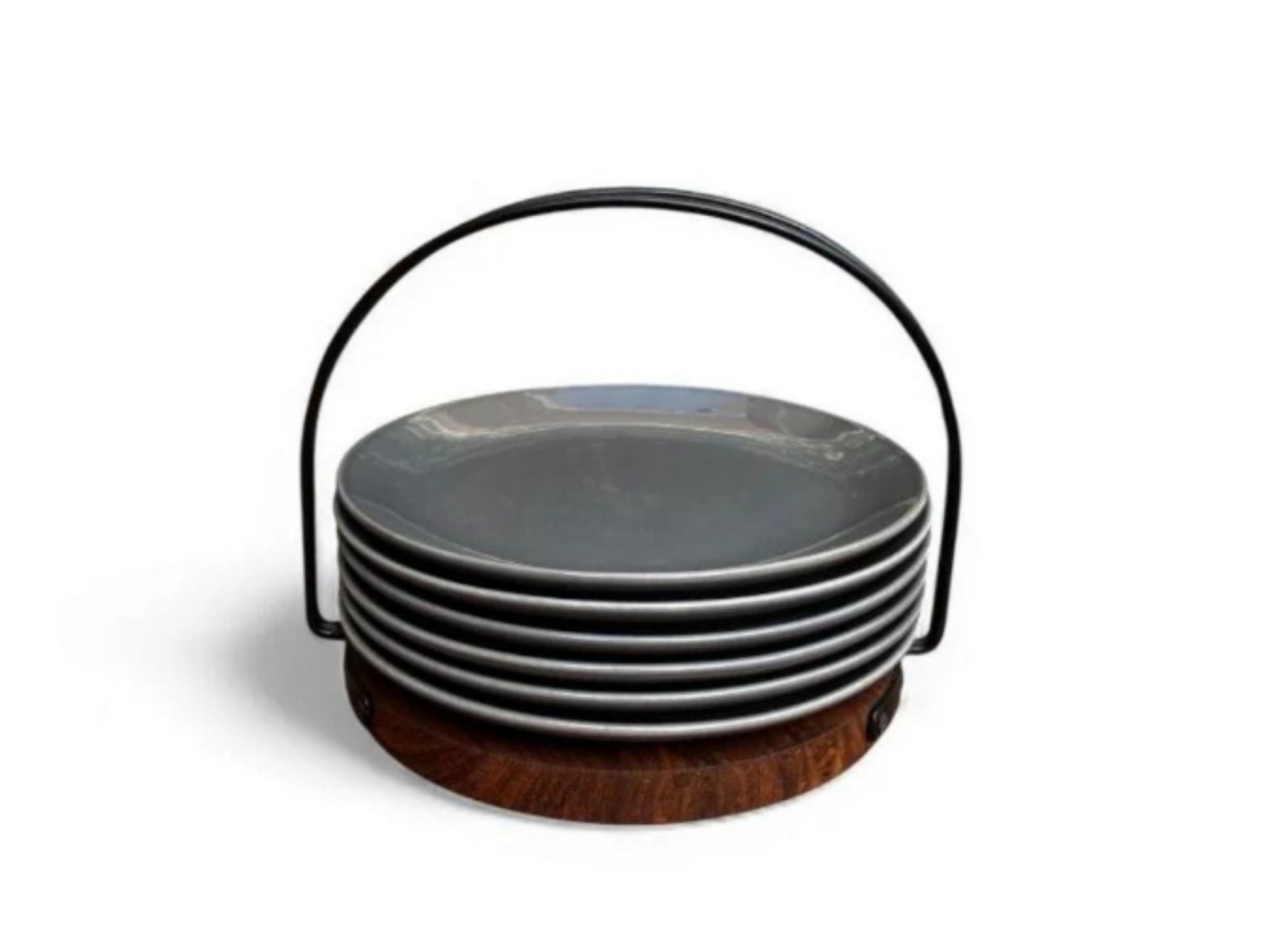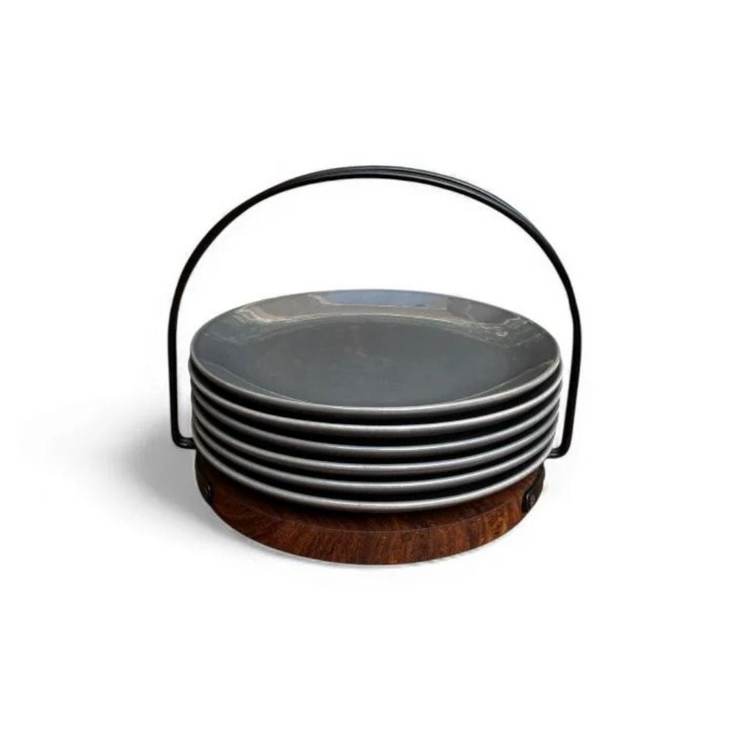 For mornings that call for calm. The Grey Breakfast Plate Set pairs Six grey-glazed plates with a wood-and-iron caddy finished with scalloped cane work. Understated yet stylish, these plates are perfect for eggs, toast, idlis, or mid-day nibbles, bringing a sense of balance to both everyday dining and hosting. The caddy keeps them neatly stacked and ready to serve, making your table feel as effortless as it looks.