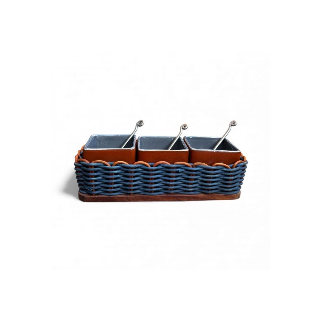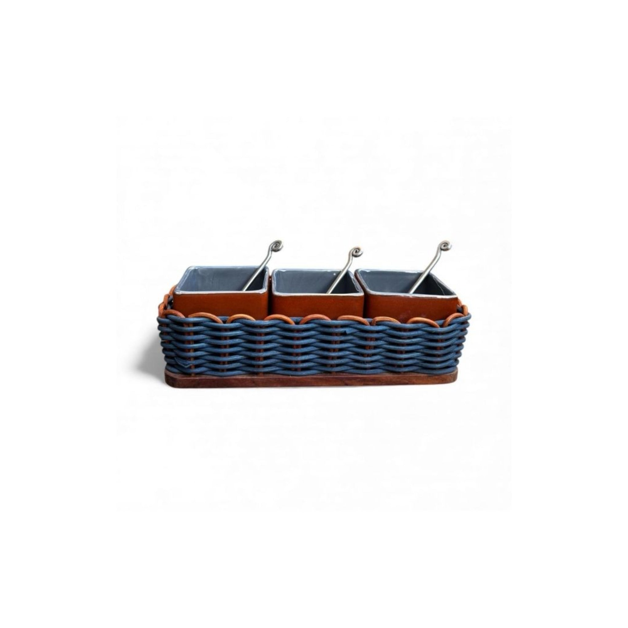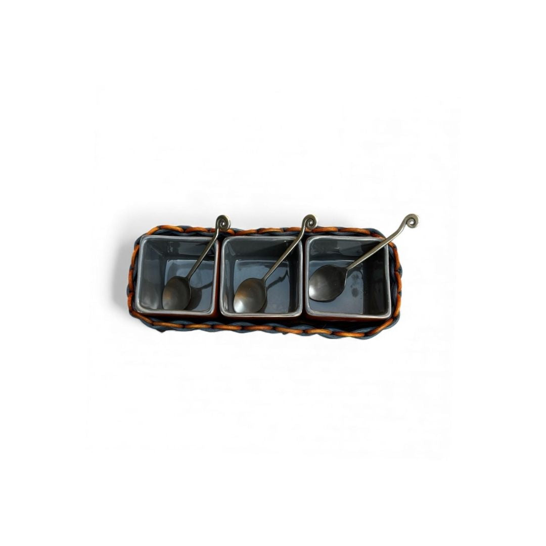 The Cottage Chutney Dip is crafted to bring both function and charm to the table. Perfect for chutneys and sauces, it also doubles up beautifully for nuts, pickles, or condiments of your choice. A thoughtful blend of ceramic bowls, steel spoons, a Sheesham wood base, and cane accents combines durability with handmade warmth. Finished in grey and Brown glazes, it slips seamlessly into everyday dining or festive spreads, proving that even the simplest serveware can add a crafted touch to your setup.