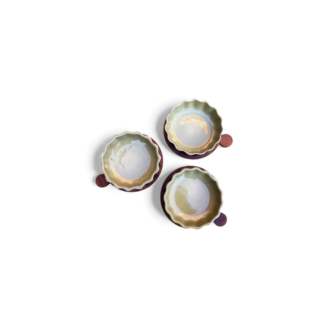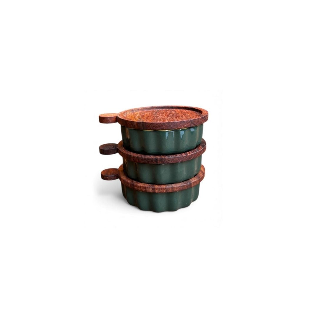 Layers of style, served fresh. The Quiche Storey – Green stacks three scallop-edged ceramic dishes in a refreshing green glaze, each paired with its own handcrafted wooden base. Whether you’re baking quiches, serving appetisers, or layering up desserts, this trio makes it easy to move from kitchen to table with flair. The serene green finish brings a touch of calm elegance, while the tiered design adds height and drama to your spread. A piece that’s as practical as it is conversation-worthy.